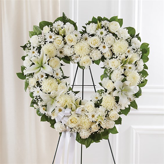 The enduring love you feel for them will keep them always remembered. This sentiment is best captured with our standing, open heart-shaped arrangement in all white. Handcrafted by our caring florists with an assortment of flawless white blooms, it is a magnificent tribute fitting for the funeral services. •Open, heart-shaped arrangement of all white roses, hybrid lilies, football mums, carnations and daisy poms; accented with baby’s breath and soft, lush greenery •Arrangement is designed on an easel and accented with satin ribbon •Measures approximately 26"H x 28"W without easel •Appropriate for the funeral home •Our florists use only the freshest flowers available, so colors and varieties may vary